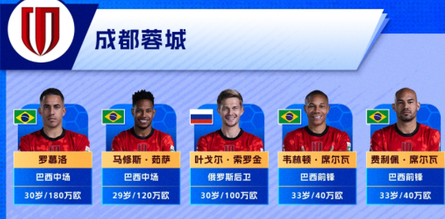 成都蓉城五外援:罗慕洛180万欧、茹萨120万欧、索罗金100万欧、费利佩和韦林顿均为40万欧,外援总身价480万欧