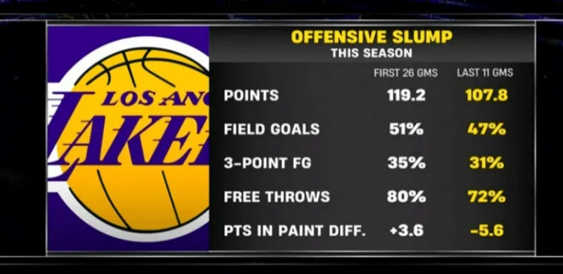 赛中,转播方晒出了湖人本赛季前26场与最近11场比赛的数据对比。